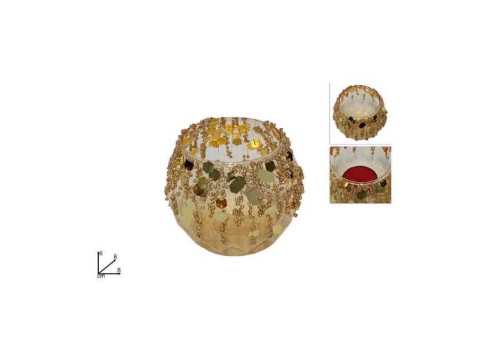 P.TEALIGHT VETRO C/PERLINE ORO